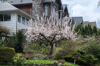 Meanwhile, in Vancouver, we are at the height of our pink season -- cherry and plum blossoms floating above our heads and drifting to the sidewalk, a skiff of pastel at our feet. During an Easter Friday walk, I kept spotting trees with spectacular pink blossoms and John obliged me by shooting them with his superior camera. At one point, both John and a young woman were taking pictures beneath a particularly eye-catching tree -- blossoms thick above and below -- as the woman's toddler scooted through the fallen petals. We had different languages, but we smiled at each other: Beautiful.