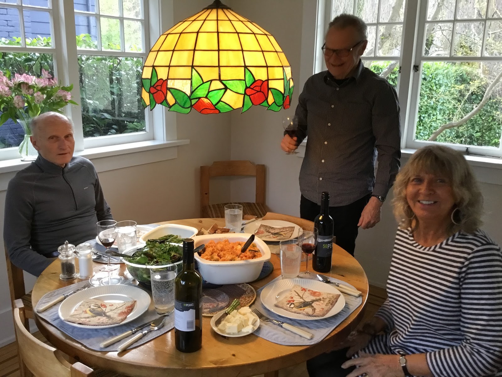 | John, my cousin Les and his wife Shelagh prepare to try my first effort at paella. I laugh in the face of those who say you should never try new recipes out on guests. |